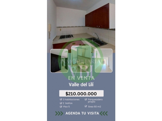 Apartamento en venta de 54m2, con vista interior, ubicado en un 5to piso (Torre B Apto 504), acceso por escaleras, parqueadero propio descubierto (9). Consta de 3 habitaciones, 2 baños, sala comedor, cocina, balcón y zona de lavandería. Tiene piso cerámico en todas sus zonas. El conjunto cuenta con zonas verdes, zona para niños, salón social, piscina y vigilancia privada las 24 horas. Cerca a centro comercial Jardín Plaza; cerca a almacenes de cadena Éxito, Makro, D1 y Ara; cerca a colegio Senderos de Lili; cerca a Universidad del Valle; cerca a estación del MIO (Universidades); Vías de acceso por la Calle 25 y Carrera 94.